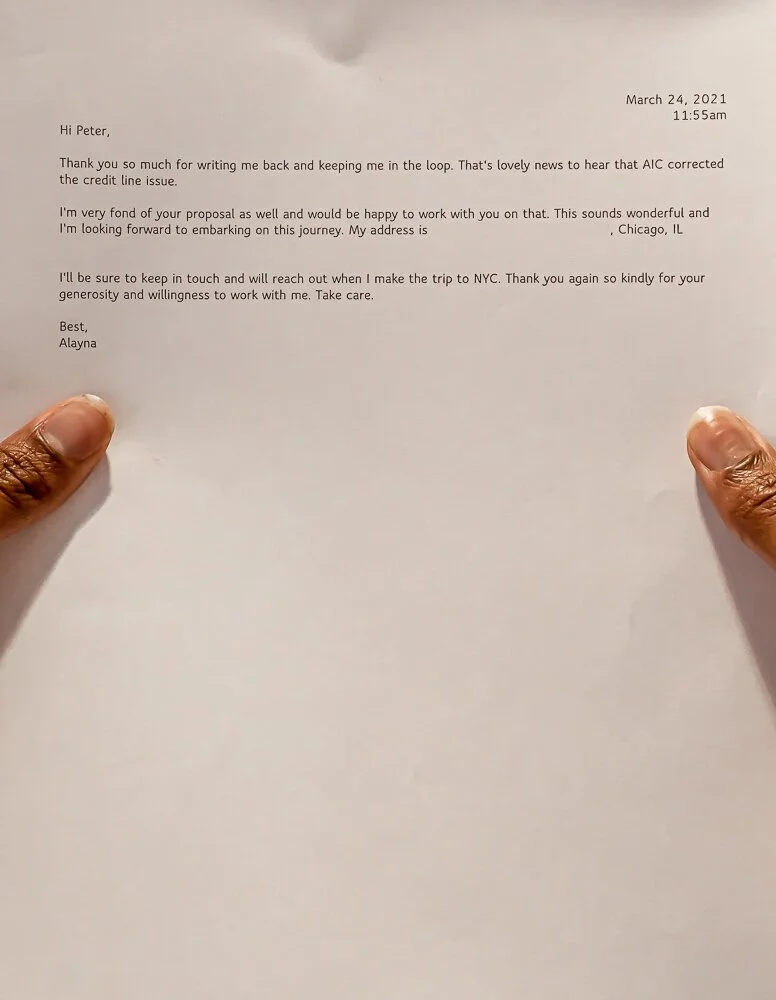I found Alayna Pernell's series while perusing the story section on PH Museum, and the cover image, the one I have shown here, riveted me. Once I arranged to feature this image, I sought to learn more about Alayna's project. To this end, I have included two additional photos from her series. These are photographs of her correspondence with Peter Cohen of the Art Institute of Chicago. In my opinion, they further our understanding of her work by showing her thought process in bringing this project to fruition.